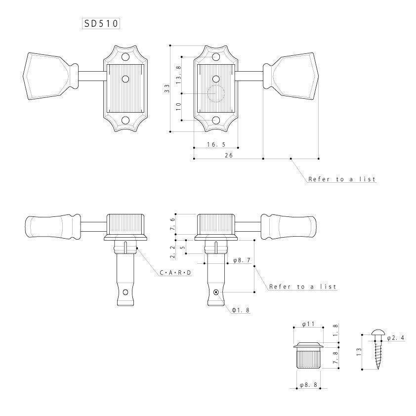 Kluson type machine heads are criticized for not having the same smooth performance, efficiency and durability that sealed gear tuners have. The SD510 series solves these problems by combining Rock-solid technology and the post collar or: self-center guide, found on enclosed gears in the base plate of the gear allowing the post to perfectly align itself with the bushing which attaches the gear to the headstock. The SD510 series uses a torque balancer to ensure steady rotation of the tuner button giving high quality sound performance as well as great functionality. Through it is use of the ideal materials selected for each component part you also obtain a far superior sound.