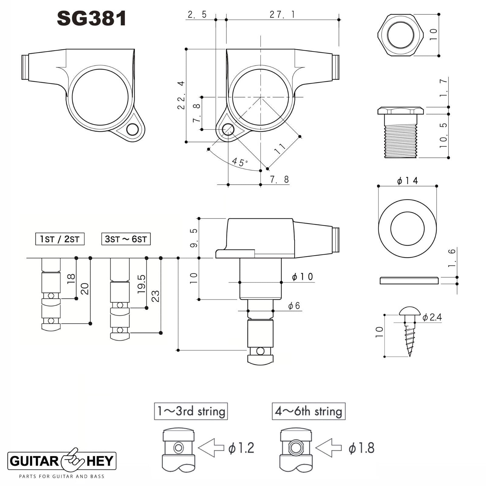 The SG381 tuning machines feature the accuracy and reliability Gotoh is famous for. They features a 16:1 gear ratio for precise, accurate tuning, and a die-cast enclosure that is permanently sealed and lubricated for years of smooth operation.