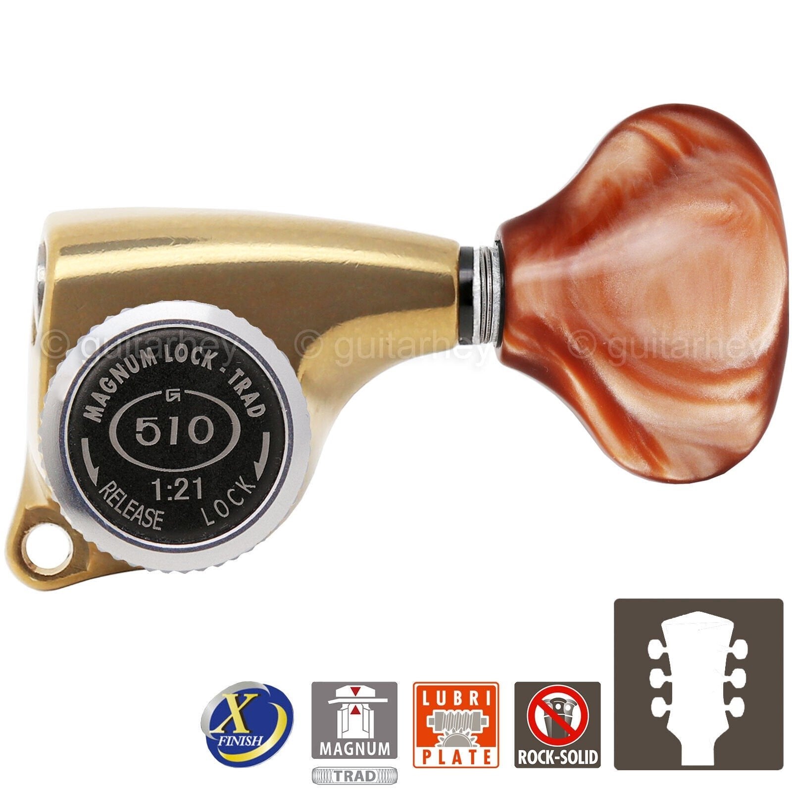 Gotoh 510 series top of the line super tuning machine heads feature the accuracy and reliability Gotoh is famous for. They features a 21:1 gear ratio for precise, accurate tuning in a small footprint, and a die-cast enclosure that is permanently sealed and lubricated for years of smooth operation.