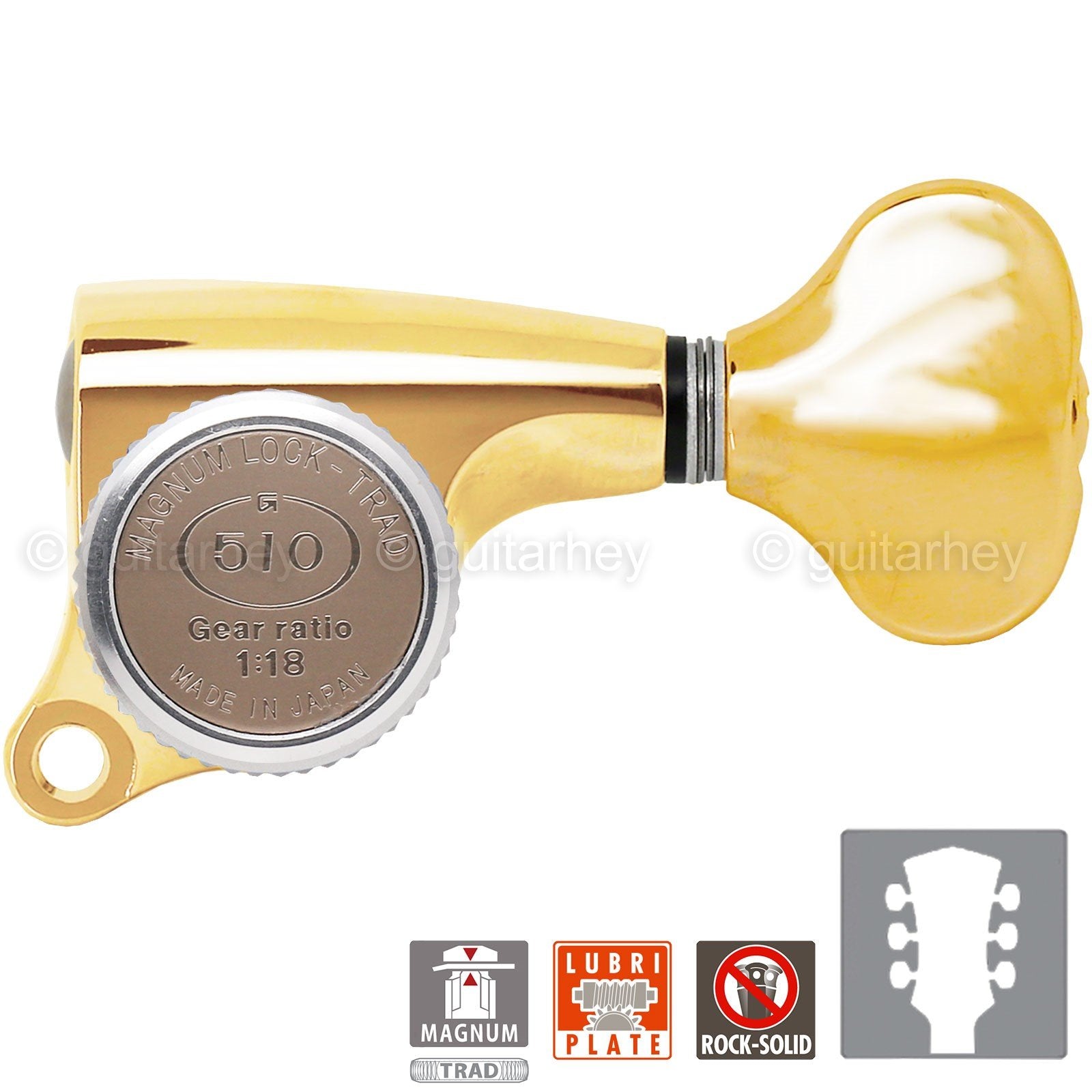 Gotoh 510 series top of the line super tuning machine heads feature the accuracy and reliability Gotoh is famous for. They features a 18:1 gear ratio for precise, accurate tuning in a small footprint, and a die-cast enclosure that is permanently sealed and lubricated for years of smooth operation.