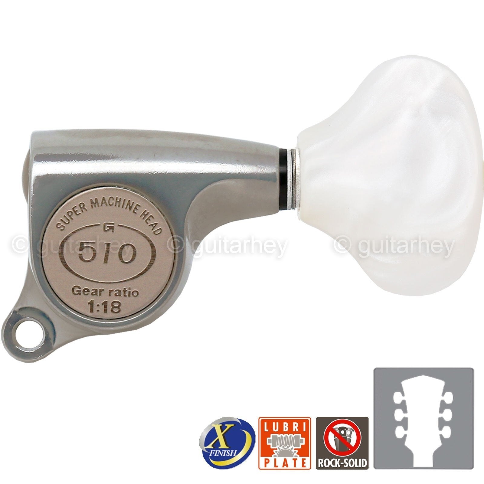 Gotoh 510 series top of the line super tuning machine heads feature the accuracy and reliability Gotoh is famous for. They features a 18:1 gear ratio for precise, accurate tuning in a small footprint, and a die-cast enclosure that is permanently sealed and lubricated for years of smooth operation.