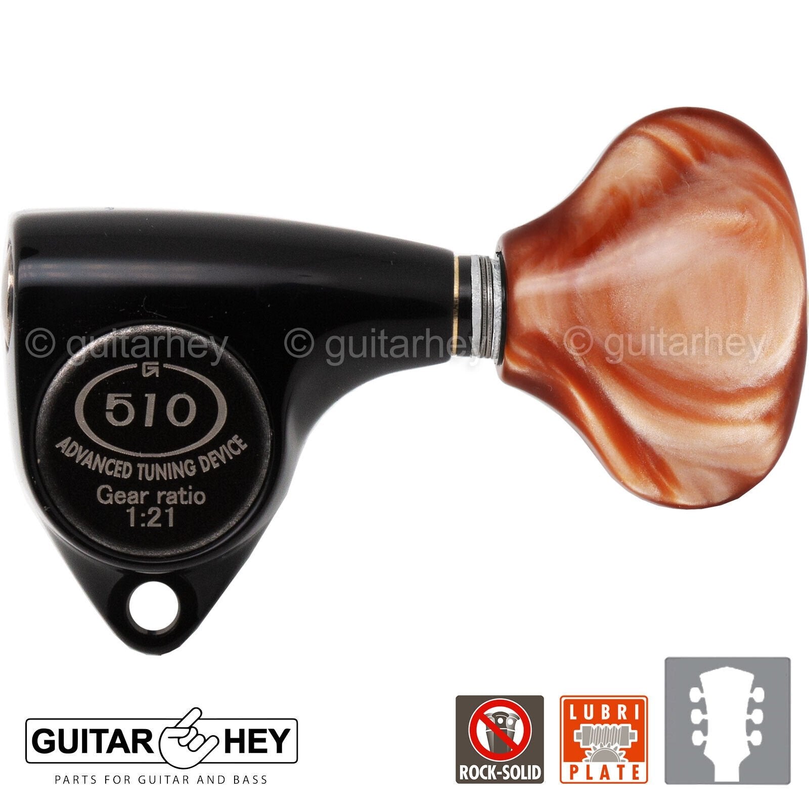 Gotoh 510 top of the line super tuning machine heads feature the accuracy and reliability Gotoh is famous for. They features a 21:1 gear ratio for precise, accurate tuning in a small footprint, and a die-cast enclosure that is permanently sealed and lubricated for years of smooth operation.