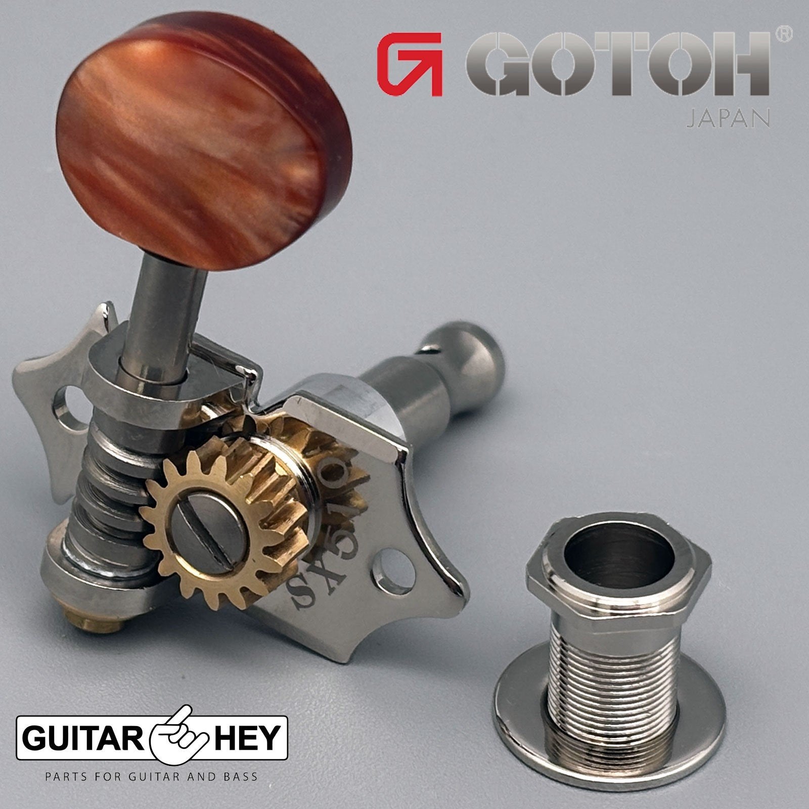 It is said that the performance and durability of open-gear machine heads is inferior to sealed-gear (Rotomatic) types. Because the bushing is physically separate from the machine head body it is difficult to accurately position the string post through it when mounting onto the guitar. The SXN510 series employs a nut mount system and can be installed as a direct replacement into the same holes drilled for Rotomatic style tuners.