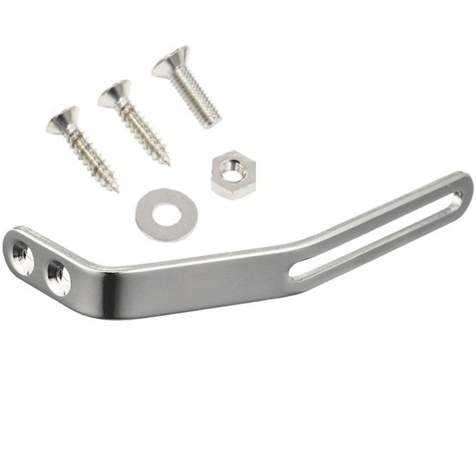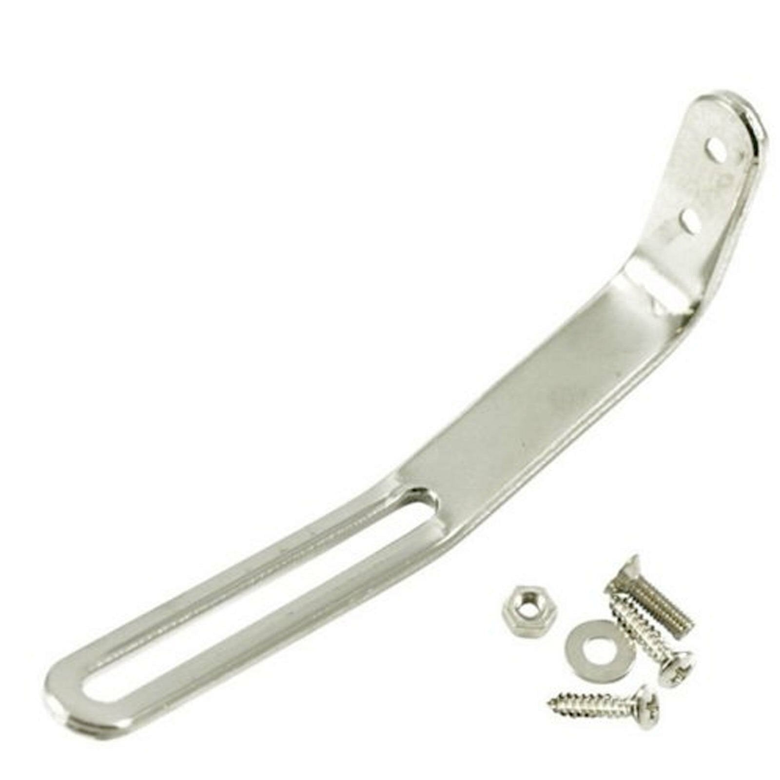 Nickel pickguard support bracket for thick archtop guitars. L shaped bracket for Archtop guitars. Includes two color matched series pickguard screws and bracket screw hardware.
