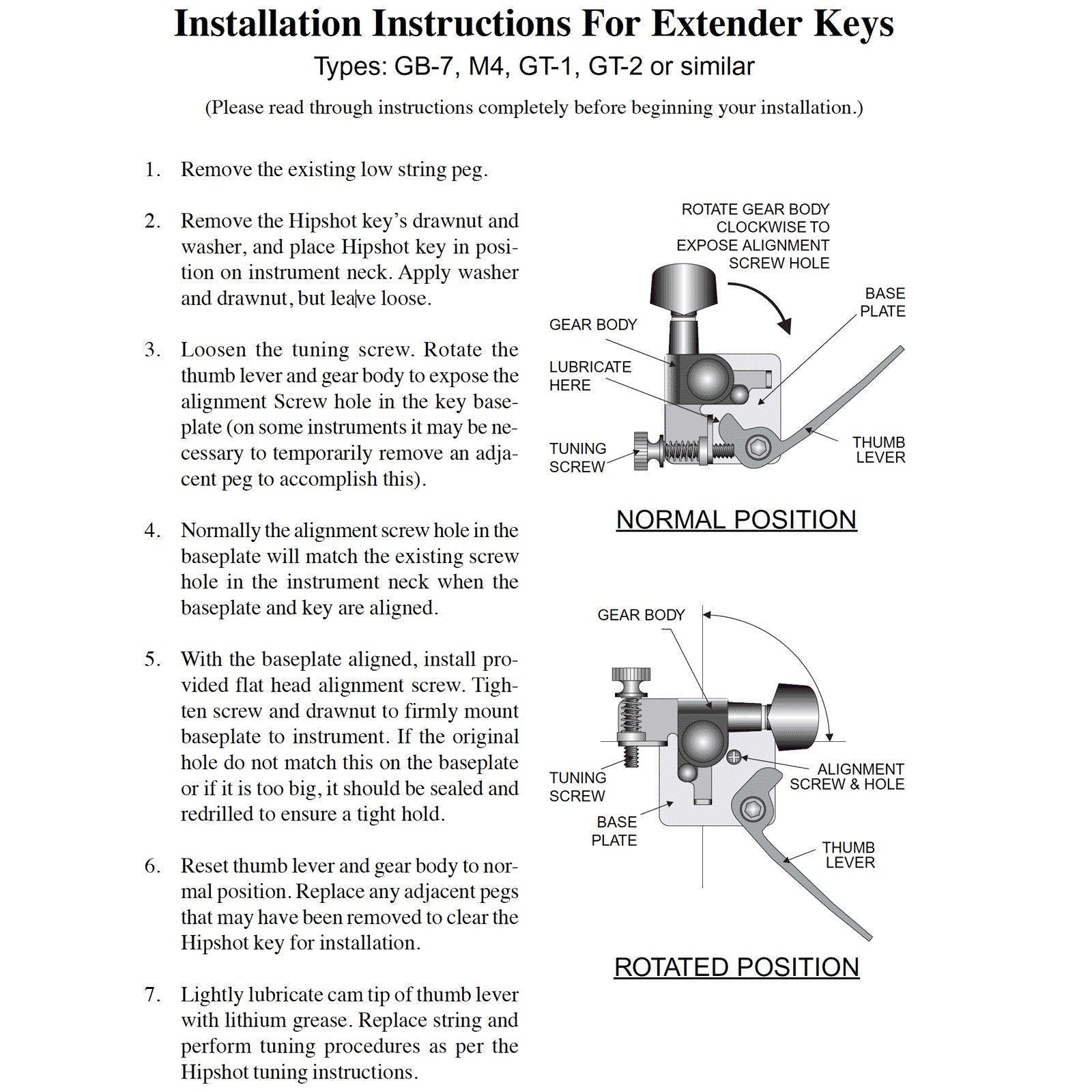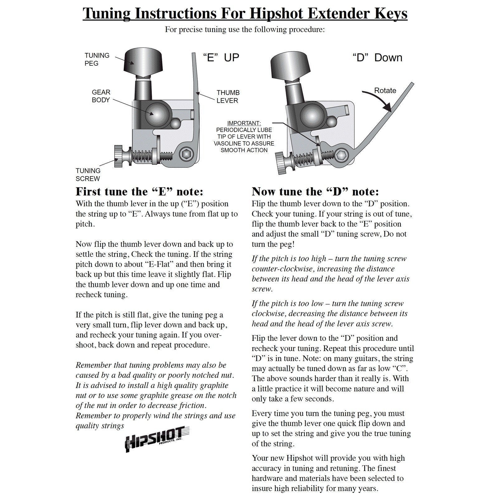 Stop retuning your guitar during sets! The GT2 guitar Xtender allows you to flip your E to D (or as low as C!) with the flip of a lever! The E tuning is set with the traditional tuning button while the low postition is set with the small thumb screw on the tuner body.