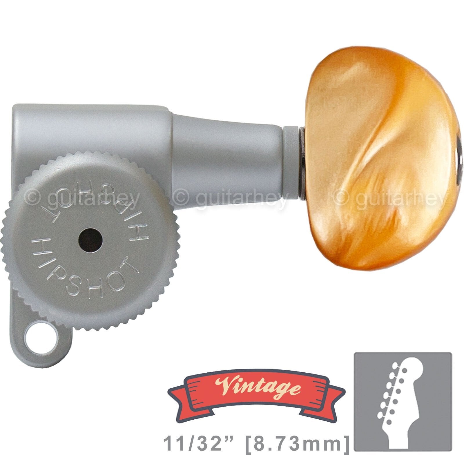 Hipshot VINTAGE 6-in-Line Locking Tuners STAGGERED Amber Buttons - SATIN CHROME