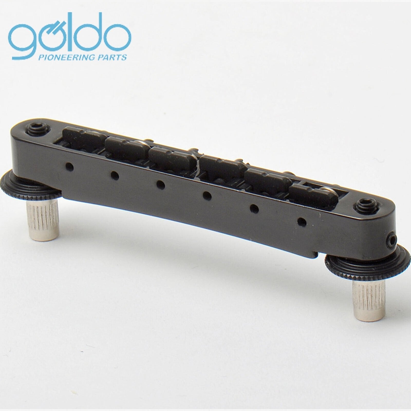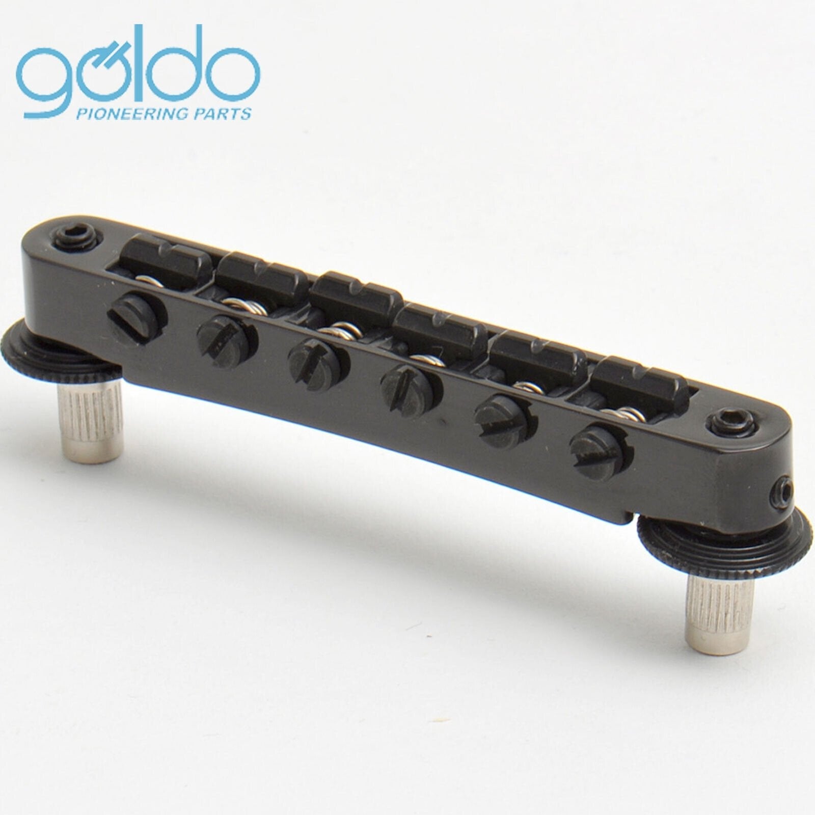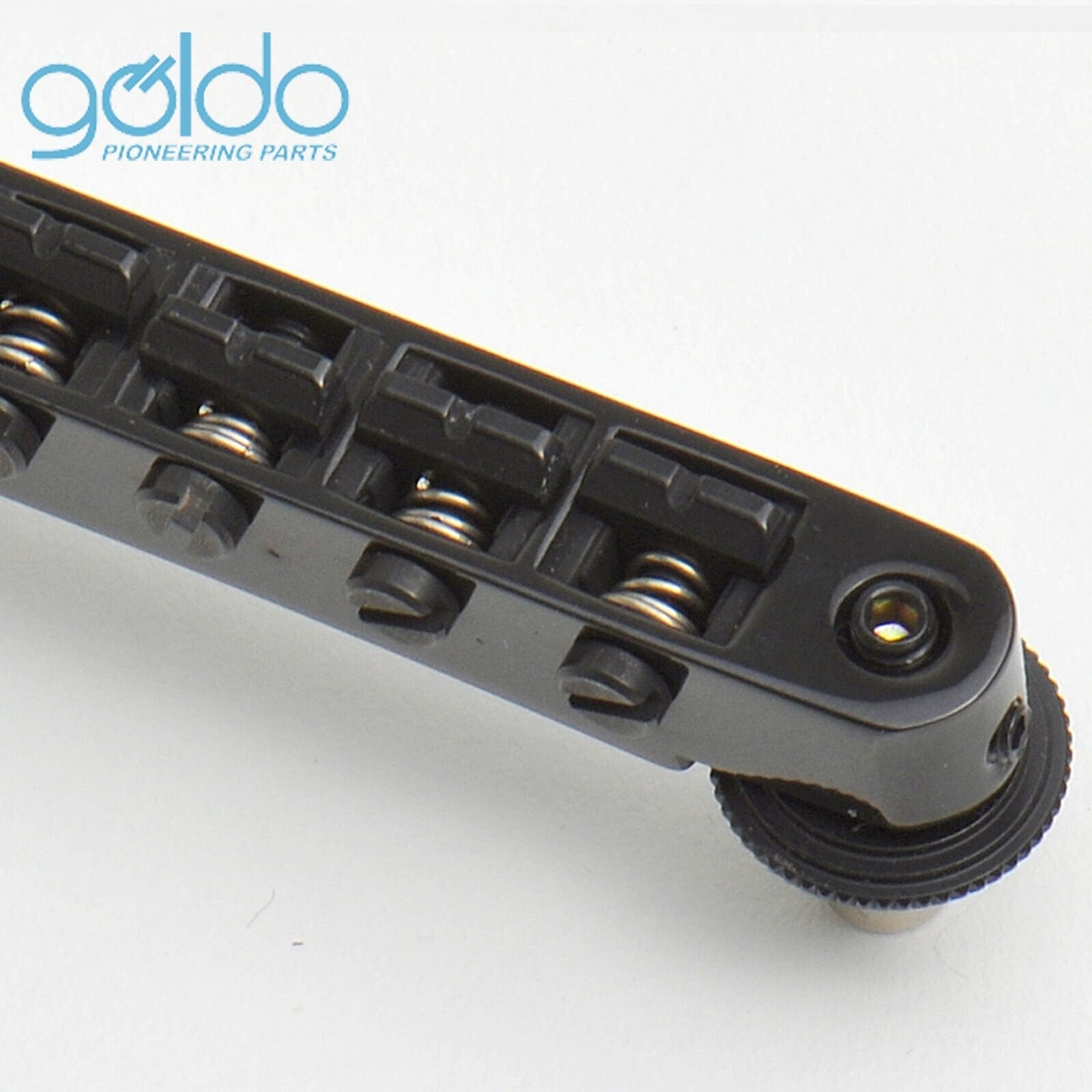 We, here at Göldo, have now integrated the good elements of the original Tune-o-matic bridge into a new, innovative bridge unit and cut the intonation screws to length in such a way that they don't touch the opposite edge of the housing, so that each string saddle only rests on three points - which gave this bridge its name. The result is an optimally solid construction that offers the best basis for a firmly articulated, sustain-rich and dynamic sound since no component can tilt or rattle which wastes vibrational energy from the string!