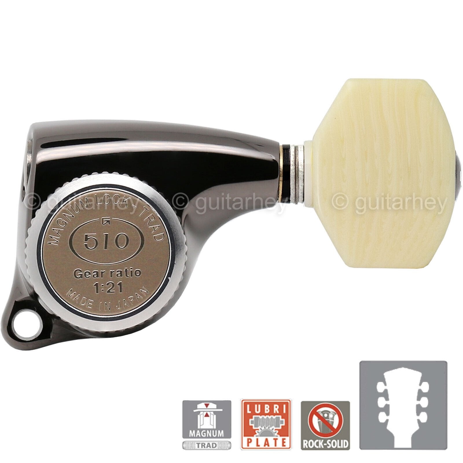 The SG510 series has evolved through improvement without compromise at any stage and come equipped with a considerable application of high-technology as standard. With the improvement of precision fitting gears, marvelous touch on playing—they have gained a considerable reputation and are trusted as the No.1 machine head by many musicians all over the world.