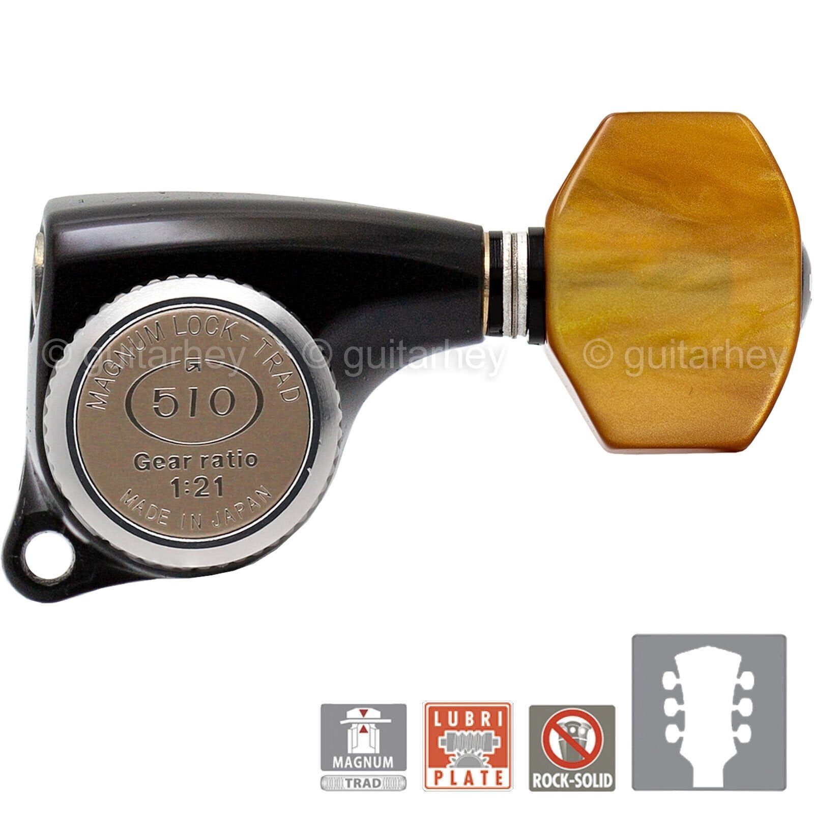 The SG510 series has evolved through improvement without compromise at any stage and come equipped with a considerable application of high-technology as standard. With the improvement of precision fitting gears, marvelous touch on playing—they have gained a considerable reputation and are trusted as the No.1 machine head by many musicians all over the world.