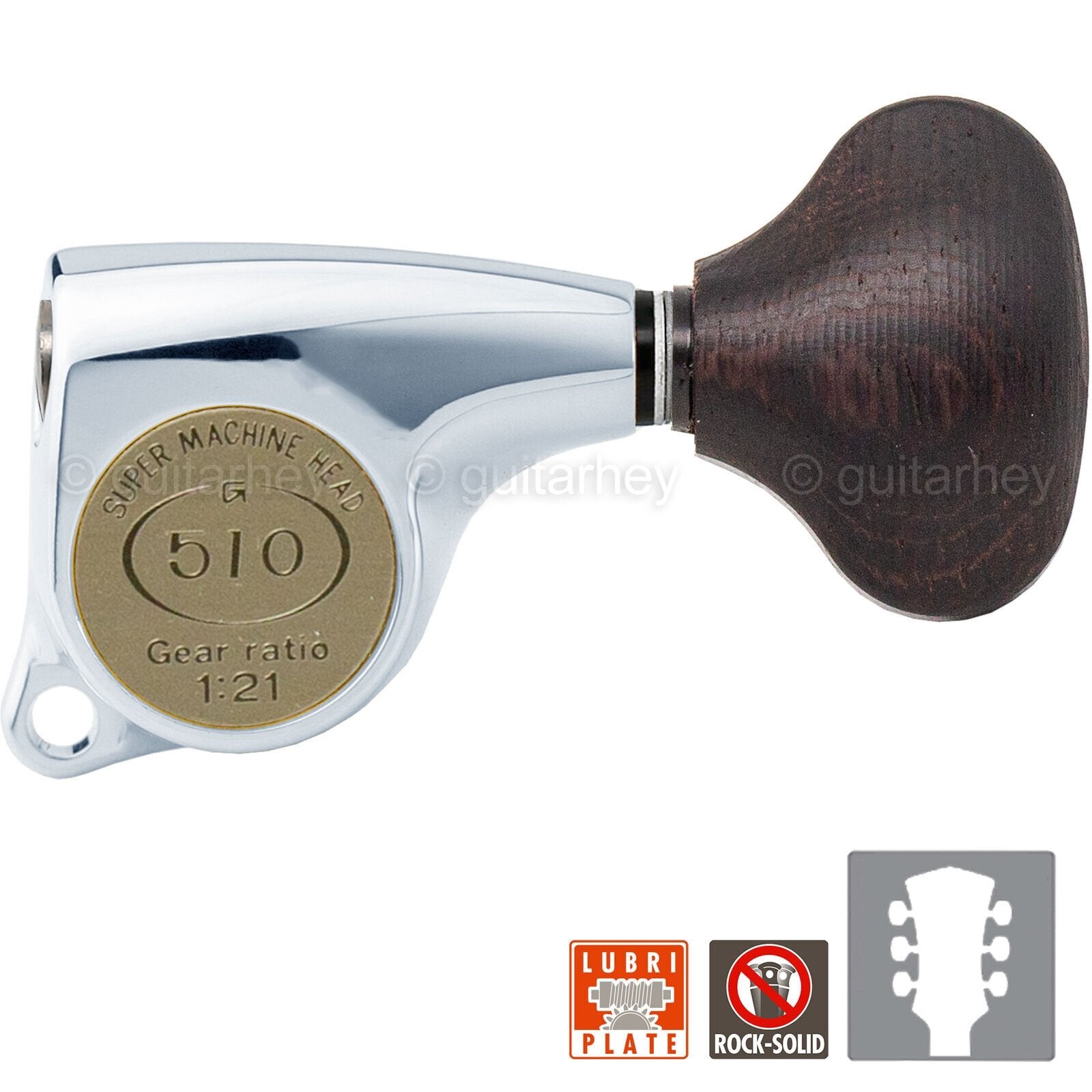 The SG510 series has evolved through improvement without compromise at any stage and come equipped with a considerable application of high-technology as standard. With the improvement of precision fitting gears, marvelous touch on playing—they have gained a considerable reputation and are trusted as the No.1 machine head by many musicians all over the world.