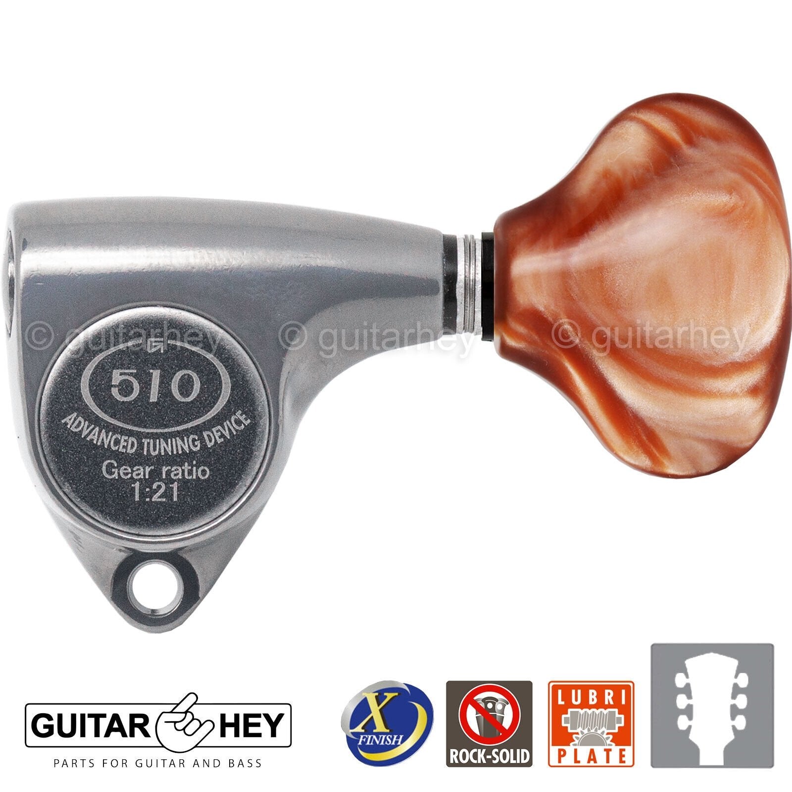 Gotoh 510 top of the line super tuning machine heads feature the accuracy and reliability Gotoh is famous for. They features a 21:1 gear ratio for precise, accurate tuning in a small footprint, and a die-cast enclosure that is permanently sealed and lubricated for years of smooth operation.