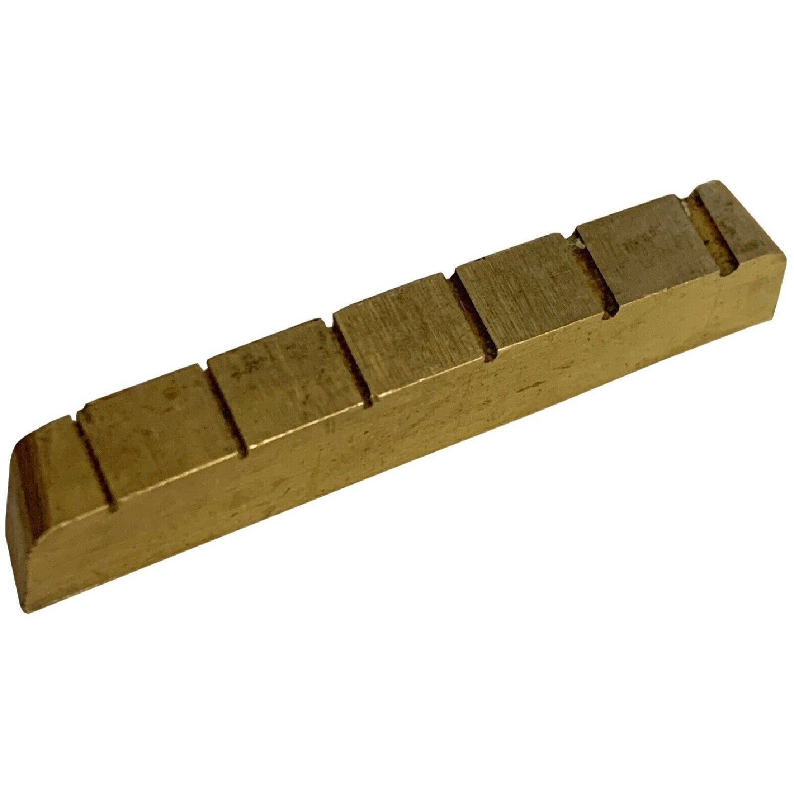 Nut for guitar machined and made of solid brass. Brass nuts can sustain a longer clear tone.