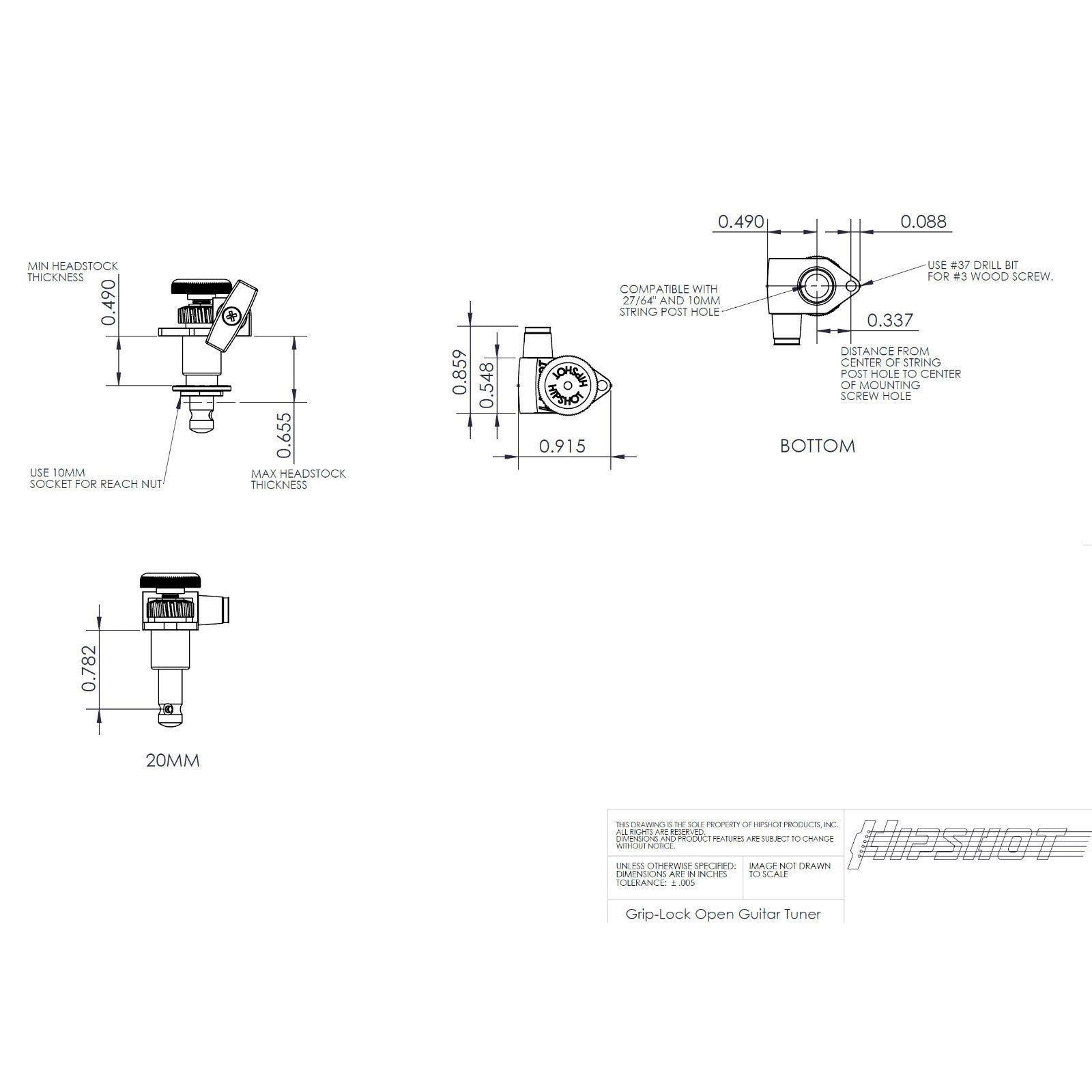 Hipshot 6 in line NON-STAGGERED Guitar Tuner Upgrade Kit Grip-Lock Open w/ UMP Plates