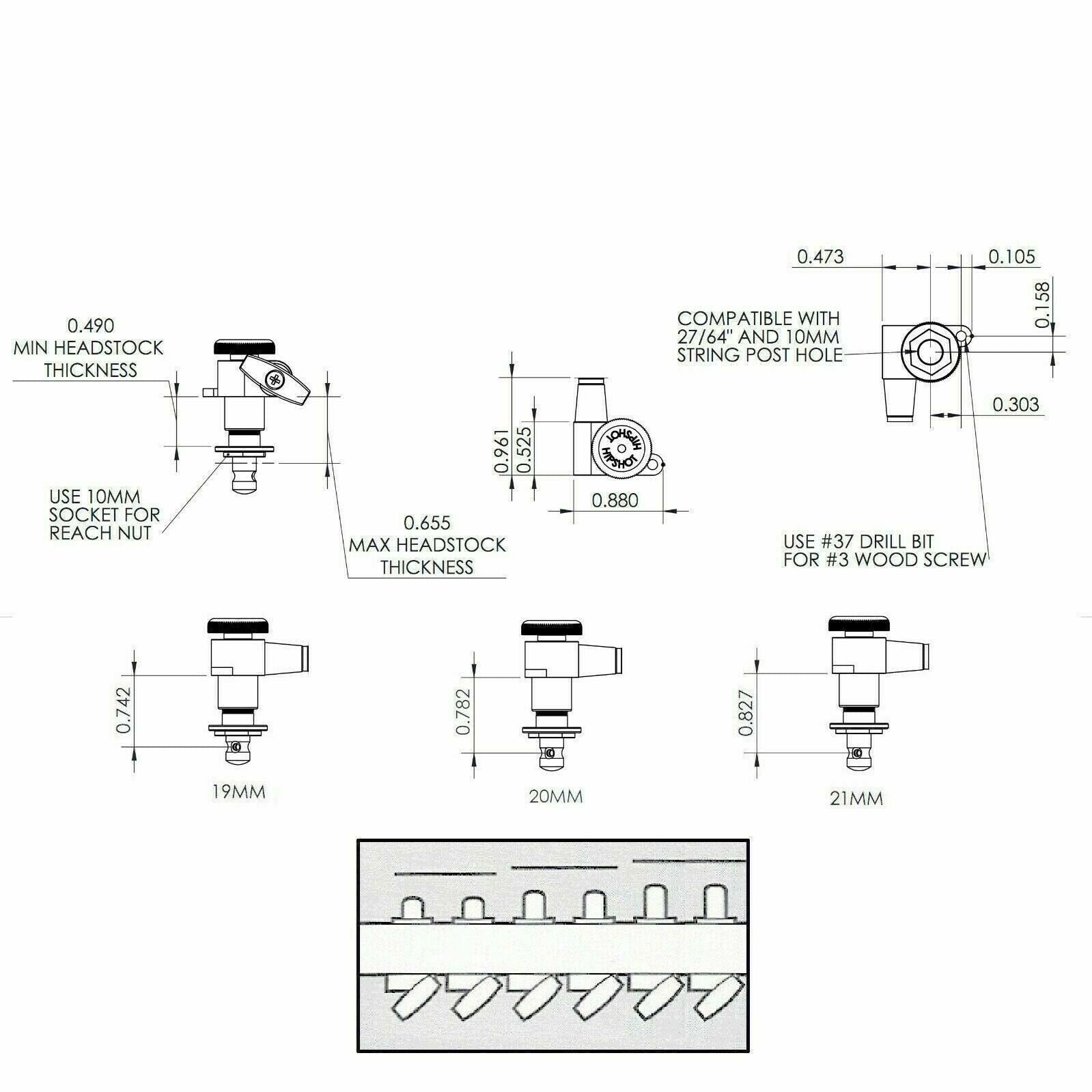 - Set w/ 6 tuners, Staggered, Treble Side, include mounting hardware