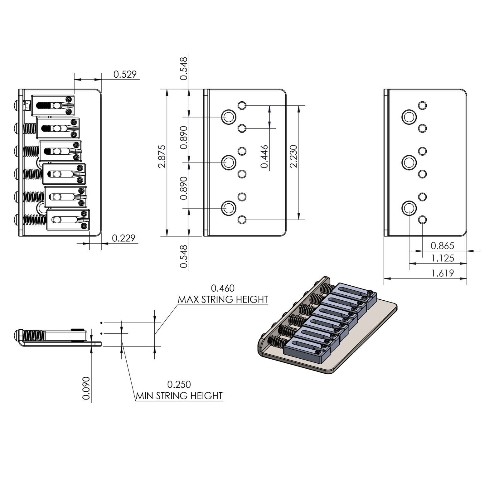 NEW Hipshot 6 String Hardtail Fixed Bridge .446 Spacing - STAINLESS STEEL