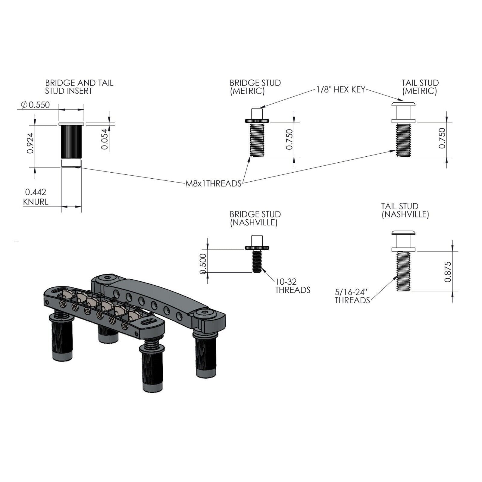 - All posts are adjustable with a 1/8" hex key. No more galling the tail-stop posts or using pliers on the bridge posts!