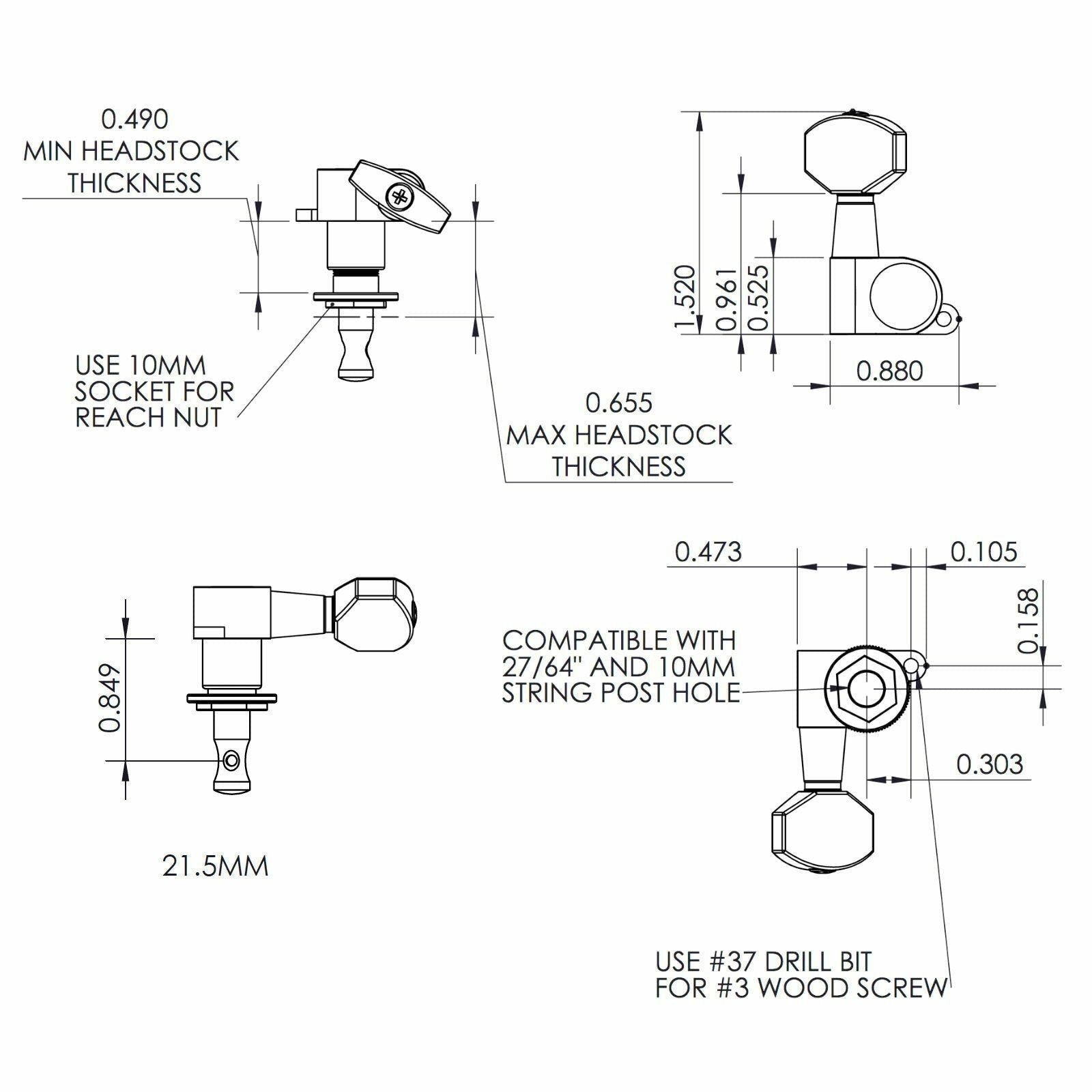 NEW Hipshot 6K2EN0B Classic Schaller Mini M6 Style Keys L3+R3 UMP Set 3x3 BLACK