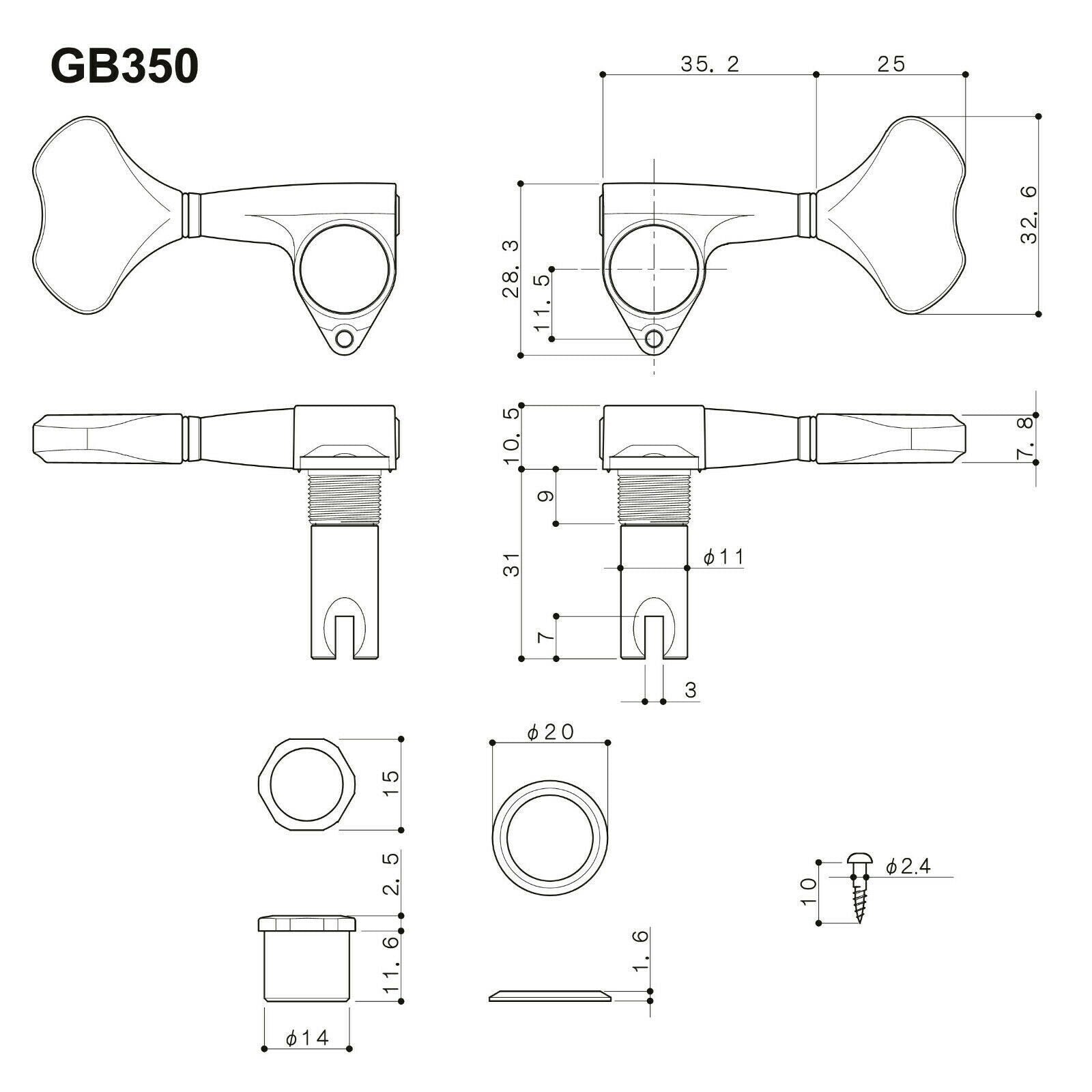 Bass guitars have weighty machine heads and by their very nature have always suffered from neck-dive. With the advent of 5 and 6 string basses, this tendency became still more acute, making long sessions uncomfortable for the musician. The RES-O-LITE series was developed to solve this problem. By chiefly using the special alloy duralumin, excellent weight savings are achieved. By use of the Rock-Solid mechanism the GB350 transmits string movement more powerfully, whilst retaining tuning and giving a smooth winding experience.