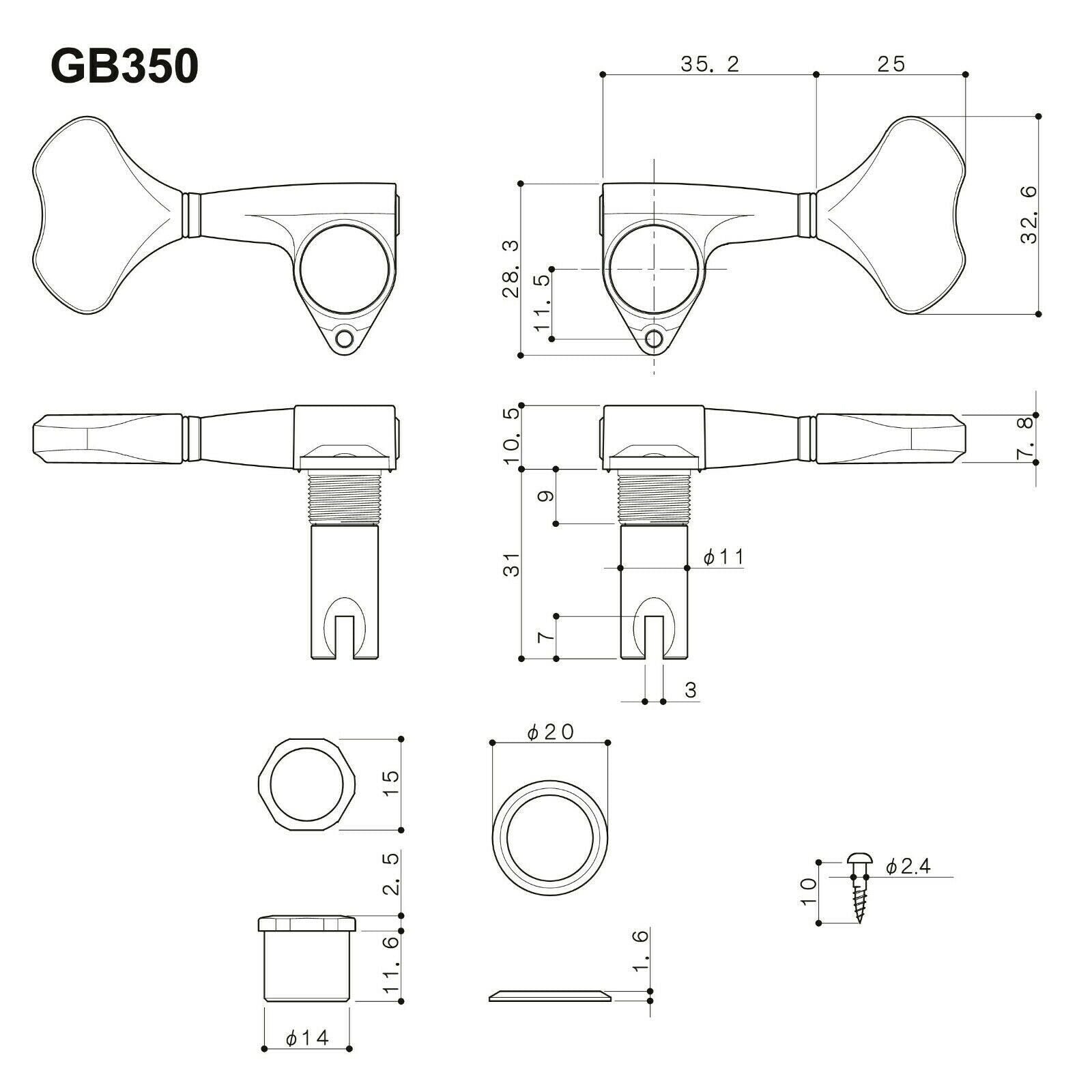 Bass guitars have weighty machine heads and by their very nature have always suffered from “neck-dive”. With the advent of 5 and 6 string basses, this tendency became still more acute, making long sessions uncomfortable for the musician. The RES-O-LITE series was developed to solve this problem. By chiefly using the special alloy “duralumin”, excellent weight savings are achieved. By use of the Rock-Solid mechanism the GB350 transmits string movement more powerfully, whilst retaining tuning and giving a smooth winding experience.