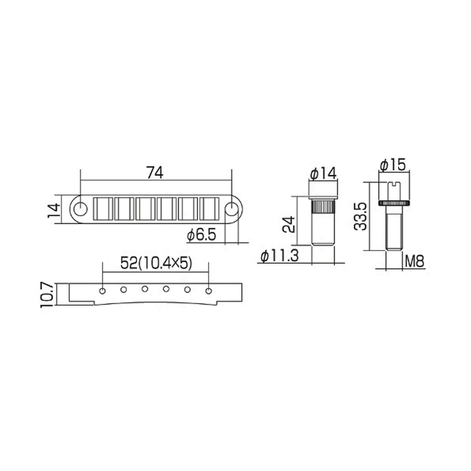 Special version with Brass Saddles. Gotoh Tunematic, Large Mounting Holes, 2-1/16" String spacing, 2-29/32" Post spacing.