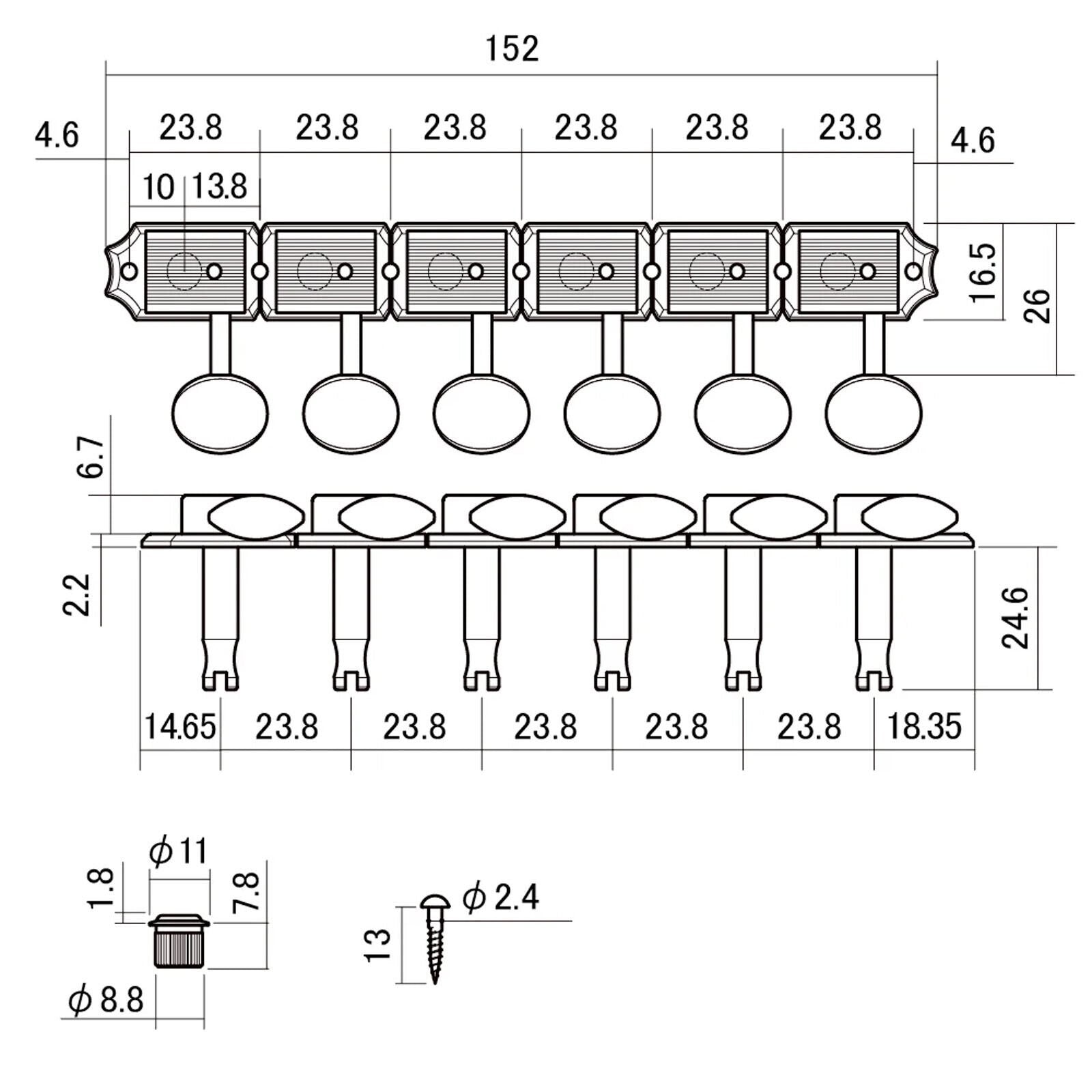 The Vintage Tone Revival machine heads based on SD91 for 6 in line right handed guitars with brass string posts and bushings.