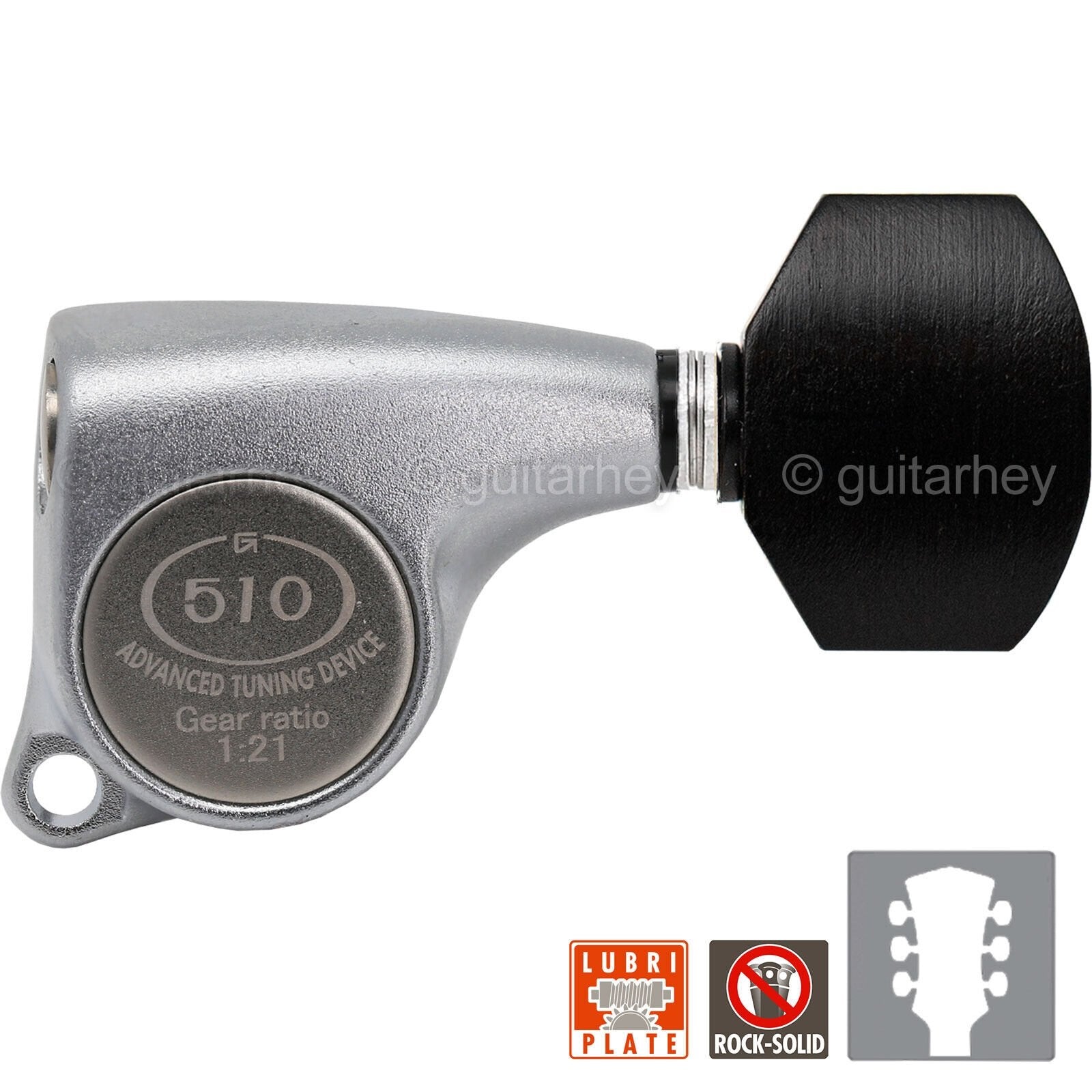 The SG510 series has evolved through improvement without compromise at any stage and come equipped with a considerable application of high-technology as standard. With the improvement of precision fitting gears, marvelous touch on playing—they have gained a considerable reputation and are trusted as the No.1 machine head by many musicians all over the world.