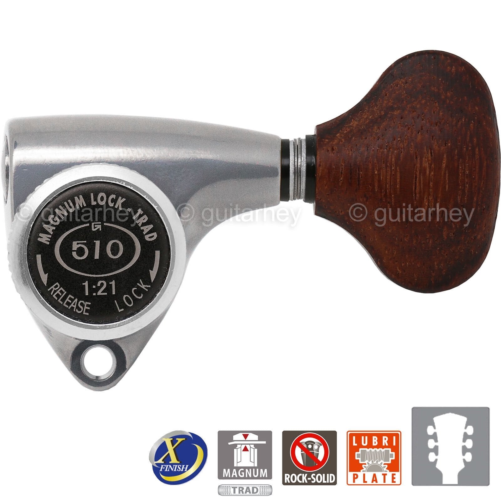Taking the concept of solid lubrication to an even higher-level Gotoh have developed a new process of application for their exclusive ?510 and ?X? series gears. By creating a ?Complex lubricating plating layer?, surface of all the moving gears have been coated through an Electro Plating process and are now enhanced with GSP that is a GOTOH original polymer compound specifically formulated to work with Gotohs LUBRI-COAT. With a ?Solid Lubrication Coat?, oil has been eliminated keeping the lubrication where it is needed for the life of the tuning machine heads.