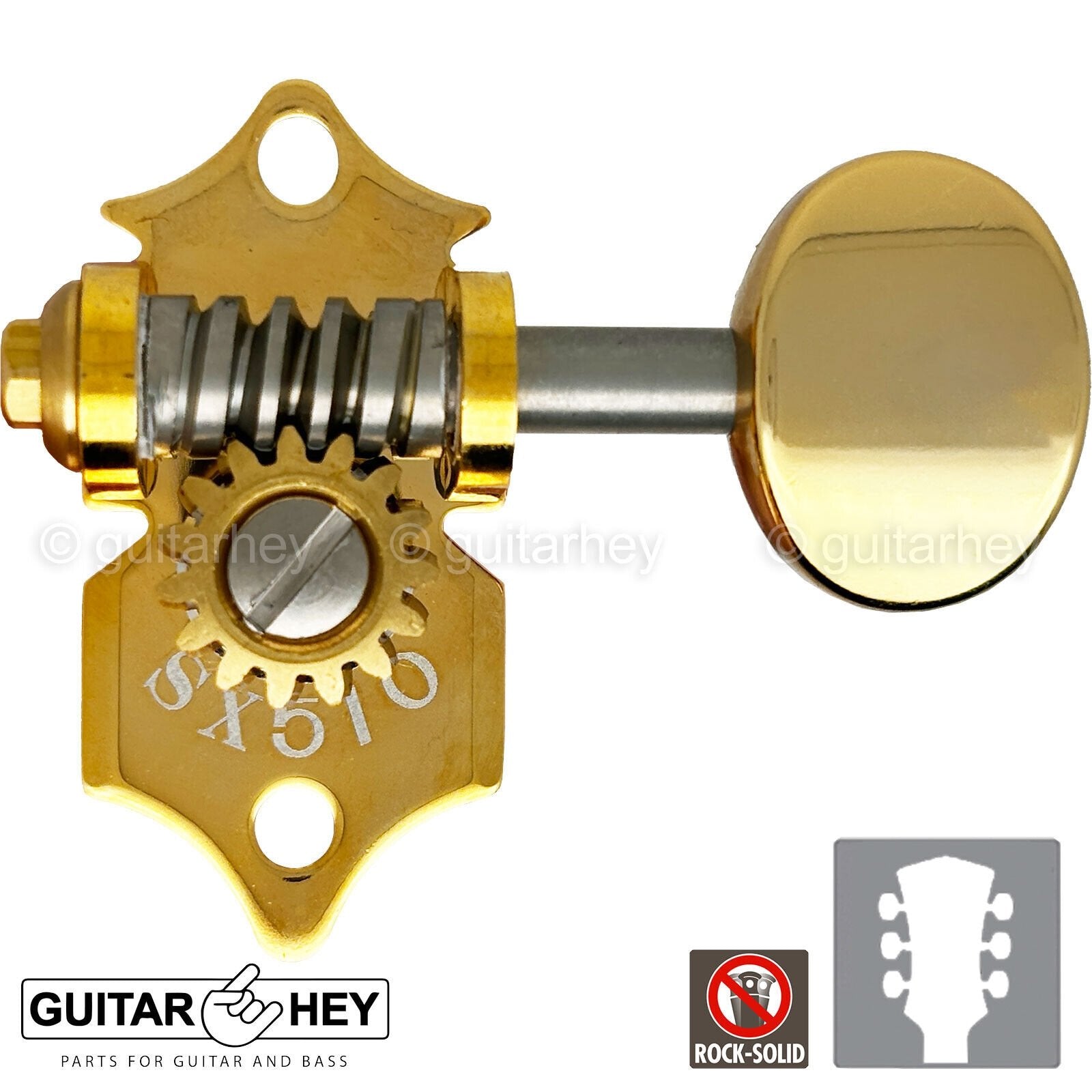 It is said that the performance and durability of open-gear machine heads is inferior to sealed-gear (Rotomatic) types. Because the bushing is physically separate from the machine head body it is difficult to accurately position the string post through it when mounting onto the guitar. The SXN510 series employs a nut mount system and can be installed as a direct replacement into the same holes drilled for Rotomatic style tuners.